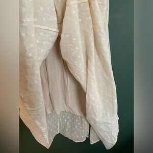 Charming vintage look ivory/light beige color midi length dress with textured dot pattern. Lined. This lightweight flowy dress features smocked bodice and puff sleeves with ruffle detailing. Front has bow tie details at bust and waist. Can be worn with sleeves or off the shoulder. Super comfortable!