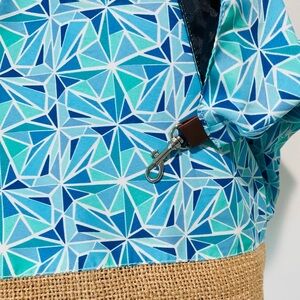 Gorgeous Peter Millar coastal tote in turquoise geometric print with natural jute base. Lightweight, beachy, and roomy. Light spotting nothing major. Navy interior with 1 Velcro pocket, 2 open pockets, and key strap. Clean inside. Approx: 31” wide (top), 15” tall at center, 9.5” deep. Lots of life left. From a smoke-free home.