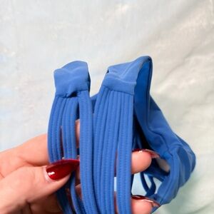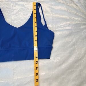 Buffbunny Collection sports bra in bright blue, size medium. Strappy back style. Band measures approx. 12” flat (unstretched). Removable padding is not included. There is a small faint white mark near the bottom band (may lift with wash) and minor stitching separation on one strap; both are shown in photos and do not affect wear.