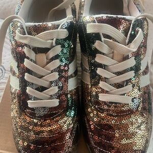 Dazzling sequin sneakers with a multicolor design. Perfect for adding flair to any outfit. Comfortable and chic for daily wear. Wear either showing laces or cover with flap. See pics