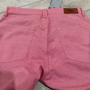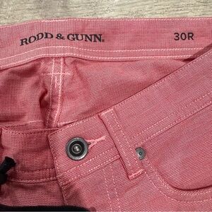 The product is a pair of Rodd & Gunn Straight Fit Jean Pants in Coral Red, sized 30R 32L. These pants are versatile for various occasions such as travel, wedding, party, casual, formal, workwear, and business. Made from cotton, they have a mid-rise and a straight leg style. The pants feature a flat front, 5-pocket design, and are machine washable. Perfect for all seasons, these dress pants from a reputable brand offer style and functionality for any man's wardrobe.