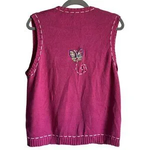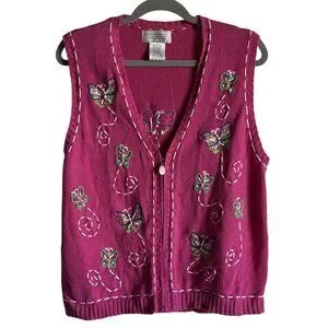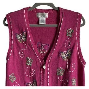 A meticulously crafted vintages knit vest that combines professional elegance with whimsical charm. The pink base is adorned with delicate butterfly appliques, embroidery and intricate white stitch detailing. Made from Ramie/Cotton. Moter of pearl zipper pull. Size large. Pre owned in good condition.