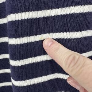 Pre-owned with light wear; small faint yellowish spot on one front white stripe, shown in close-up photos. Knit fabric otherwise clean and intact with no holes, snags, or pilling. Interior brand and care tags are present and legible.