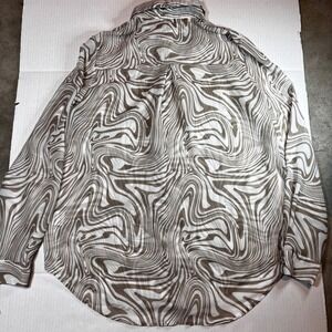 A stylish button-up top featuring a unique swirl print. It includes a button-down front, a pointed collar, and buttoned cuffs. The lightweight fabric ensures comfort and breathability, making it suitable for various occasions.