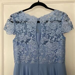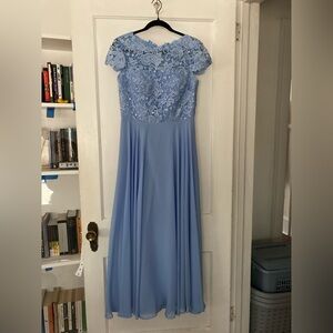 This is a like new JJ House bridesmaid dress, in light blue chiffon. The skirt is three layers of chiffon. Length approximately 55”