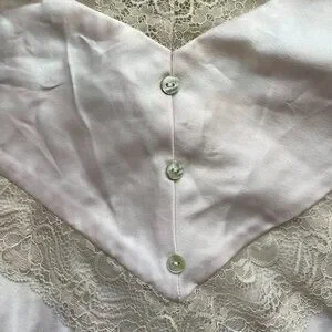 Lace trim V-neck. Pullover style. Adjustable straps. Buttons at front. Lace inset at front.