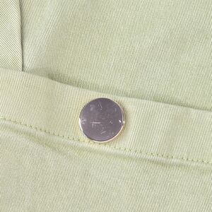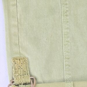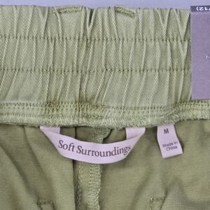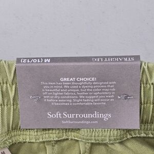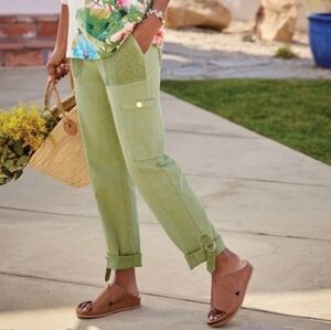 Women's Soft Surroundings Mara Vista Eyelet Pants in size Medium (10/12). The color is Tarragon green. They are an easy pull-on, straight-leg, full length style (when unrolled) with eyelet patch pockets, side cargo pockets with snap closures, belt loops, and roll-tab/cuffed hems for a relaxed utility look. Soft material with a bit of stretch for a comfortable fit. New with tags, with a very light mark near the bottom of the right leg (may wash out with treatment) and minor surface scratches on the cargo pocket snap hardware (purely cosmetic) - see last three photos for close-ups of these issues (not nearly as noticeable when worn). Ships fast from a smoke-free home.