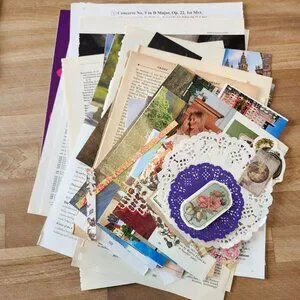Bundle includes vintage book pages with both text and pictures, floral pictorial spreads, full sized pages and small paper, different textures and sizes, stickers, doilies, sheet music, glassine envelope, vintage maps.