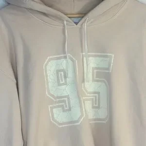 This premium Current/Elliott hoodie is made from an ultra-high-quality heavyweight fleece. The neutral beige tone, cracked “95” graphic, and slightly cropped fit give it a minimalist, elevated look with the designer feel the brand is known for. A raw edge rolled hem adds a relaxed attitude .
