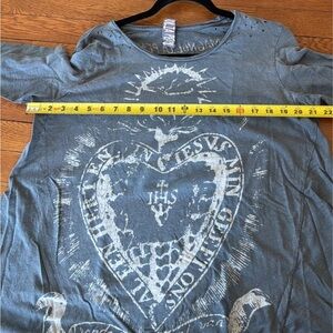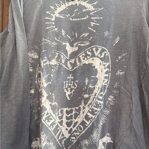 Unique gray tee with artistic graphic. Distressed style for a trendy look.