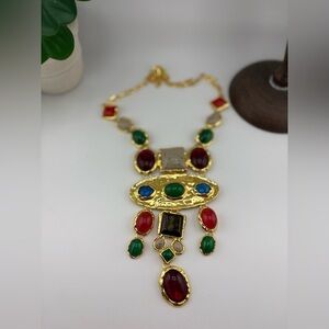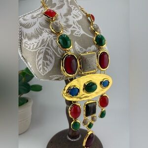 This stunning vintage-inspired statement necklace features a luxurious mix of deep red, emerald green, sapphire blue, and golden tones. Each stone is set in textured gold metal with a bold, artistic design that instantly elevates any look.