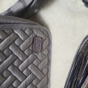 This Lug messenger bag in gray features a sophisticated quilted geometric pattern, offering both style and functionality. Crafted from a soft, padded fabric with a slight sheen, it provides a modern and sleek look. Ideal for everyday use, this bag combines durability with a chic design.