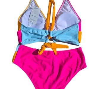 Vibrant colorblock bikini set featuring pink, orange, and blue hues. Stylish and eye-catching design. This adorable swimsuit is new and never worn but tags have come off.