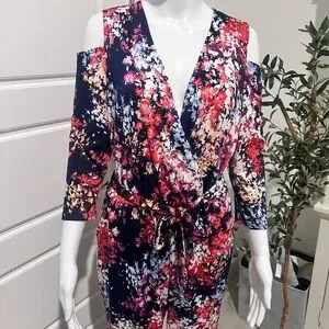 Stylish cold shoulder jumpsuit with vibrant floral design. Features a flattering wrap front and tie waist.