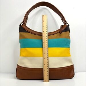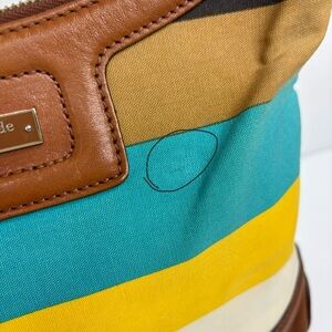 Description: Vintage, hard to find, Kate Spade spring / summer yellow, teal, cream, tan, black & brown striped hobo shoulder bag