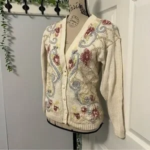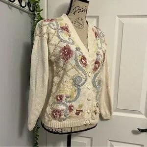 Elegant Floral Knit Cardigan - Cream, Blue, and Pink
