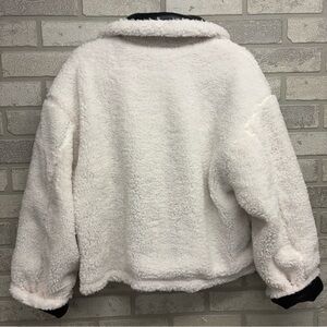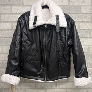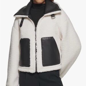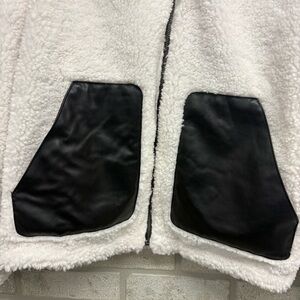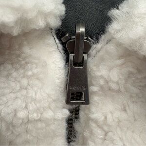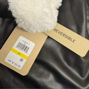 This is a new with tags Levi's women's reversible jacket in size M, featuring a white teddy fleece side and a black faux leather side. The white side has a black faux leather collar, two large black faux leather patch pockets, and black faux leather cuffs. The black side has a white teddy fleece collar and cuffs, and two pockets. Both sides feature a full-zip closure with a Levi's branded zipper pull. The jacket is made of 100% polyester faux fur and 100% polyurethane faux leather.