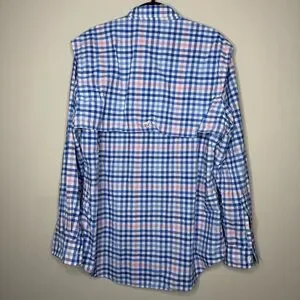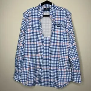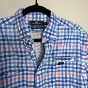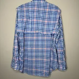 Stylish blue and pink checkered button-up shirt. Features a classic collar and button closure.
