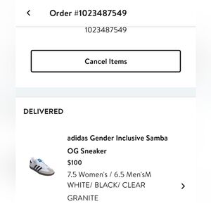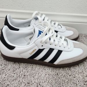 Gender Inclusive Samba OG sneaker. Purchased from Nordstrom. NEVER WORN. Great Condition. Features black stripes on white leather. Iconic design with blue logo detail. Size 7.5. Does not come with original box.