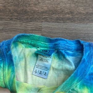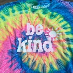 Colorful tie dye graphic tee featuring a vibrant rainbow spiral design with “Be Kind” text and sun detail on the front. Soft 100% cotton fabric with a relaxed unisex fit. Youth Large but can comfortably fit a women’s XS–Small depending on desired fit.