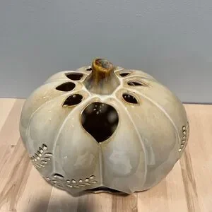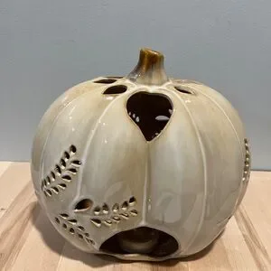 Elegant ceramic pumpkin with leaf cutouts. Perfect for seasonal decor. Adds a touch of charm to any space. You can place a candle inside the pumpkin.