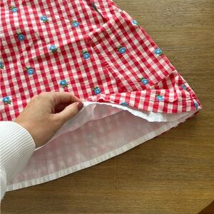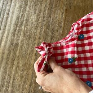 Charming checkered dress with vibrant red and white gingham pattern. Perfect for casual outings. Comfortable and stylish. Double lined with pockets. 100% cotton blue embroidered flowers over the checkered print. Knots at shoulders