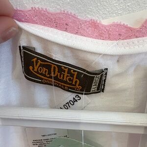 Stylish Von Dutch tank top. White with pink lace trim. Perfect for everyday wear.