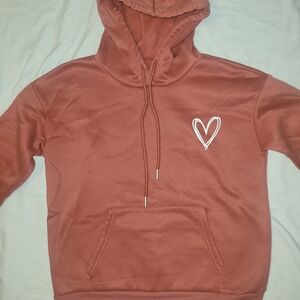 Cozy rust-colored hoodie featuring a white heart design. Perfect for casual wear.