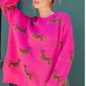 Chic pink sweater adorned with a charming brown animal pattern. Ideal for casual wear. Description: -ROUNDED NECKLINE -DROPPED SHOULDERS -RELAXED AND LOOSE FIT -SIDE SLITS -ROLLED UP CUFFS -2X MEASUREMENTS : LENGTH - 30" & BUST - 32.5" ********* Fabric: KNIT Content: 52% ACRYLIC 28% NYLON 20% POLYESTE