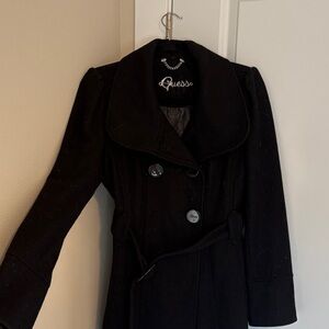 Sophisticated black trench coat by Guess. Features a sleek design with button details. Perfect for any occasion.