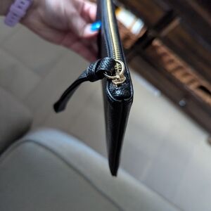 Elegant black wristlet clutch. Features gold logo detail. Secure zip closure. Perfect for any occasion.
