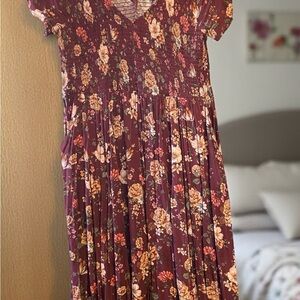 Torrid Floral Smocked Midi Dress Size 1 (1X 14/16) | Burgundy Fall Boho | EUC