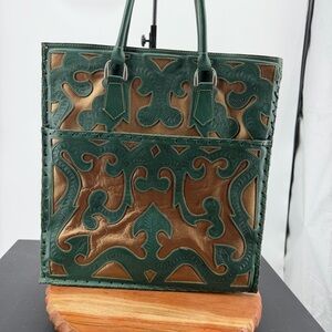 JL Saldivar leather hand tooled shoulder tote bag teal bronze