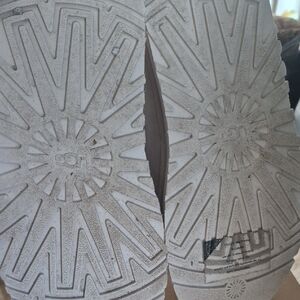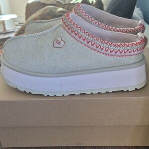 Cozy UGG slippers with a cute heart detail. Soft tan upper with pink accents. Ideal for casual wear.