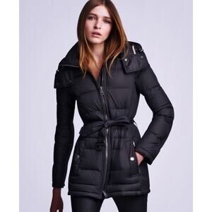 Mid-length puffer jacket with a weather-resistant quilted shell and a belted waist. Snap high-neck collar, removable hood, full-front metallic zipper, and side stretch ribbing. Four front snap pockets and a detachable matching belt.