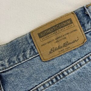 Eddie Bauer high rise mom jeans in a classic medium wash denim. These vintage-inspired pants feature a relaxed fit through the hip and a tapered leg for a timeless silhouette. Crafted from 100% cotton, they offer a sturdy, non-stretch feel with a traditional five-pocket design and zip fly closure. Perfect for everyday wear, these authentic denim jeans provide a comfortable and flattering petite fit.