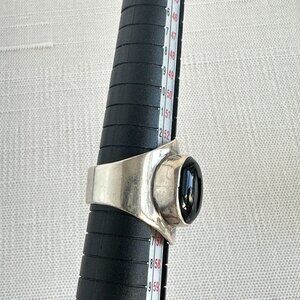 Vintage modernist sterling silver and onyx ring, marked "Mexico 925". This piece has a great sculptural feel, with a smooth black onyx cabochon. The shape is bold without feeling heavy, and it has that classic Mexican modernist look that collectors love.