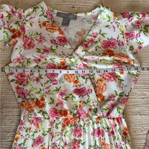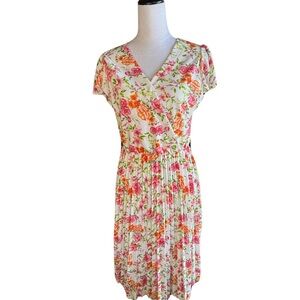 Romantic floral midi dress with a wrap-style V-neck bodice and soft pleated skirt. Features short sleeves, an elastic waist for a comfortable fit, and an allover rose print in pink and peach tones on a light background. Feminine and flowy with a flattering silhouette.