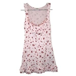 Kimchi Blue mini dress features a charming pink fabric adorned with a delicate red floral print. Designed with a flattering milkmaid-style bust, it includes a cinched gathered bodice and a sweet lace-trimmed neckline accented with a small satin bow. The sleeveless silhouette is finished with a playful ruffled hem, creating a feminine and airy look perfect for warm weather.