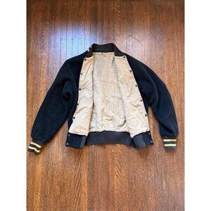 Black wool varisity jacket from the 40s. It has yellow stripe bands. There is a cool applique on the back that says DELTA CHAMPS 45-46. It snaps up the front and is flannel lined.