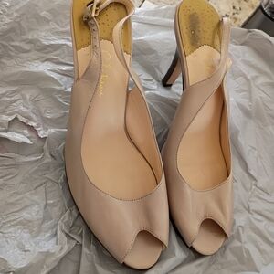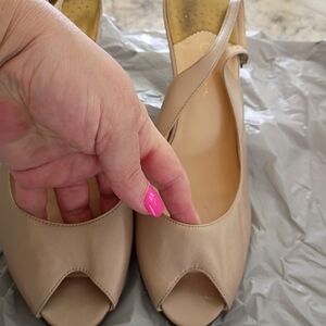 Chic soft metallic gold slingback heels with a stylish peep-toe. Ideal for any occasion. Nike Air comfort. Angelina Jolie made this an iconic shoe when she wore it throughout her pregnancy stating I bought these in every color because it's the only comfortable heels I can wear during pregnancy. I'm selling several other brand name items. Bundle and save. Cross posted. Thanks for looking!