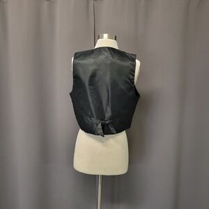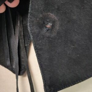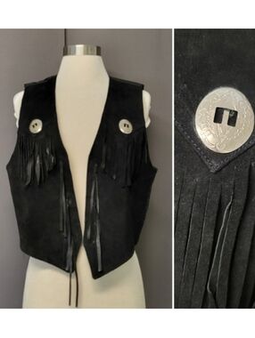 Vintage black suede vest features a classic western aesthetic with tiered fringe across the chest and long hanging tassels. Ornate silver-tone concho accents add a touch of Southwestern flair, while the back includes a decorative bow detail for a unique finish. The open-front design and smooth lining make it an ideal layering piece for festivals or themed events.