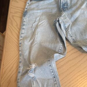 Stylish straight leg jeans. Light blue wash. Distressed details on legs. Comfortable fit.