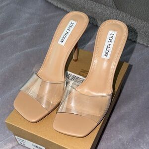 Chic Steve Madden heels with a nude base and clear strap. Perfect for versatile styling. Size 9. Never worn outside just tried on inside the house