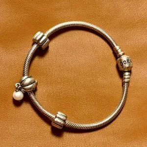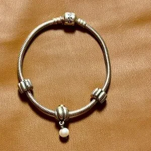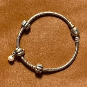 This vintage silver bracelet from Pandora features a delicate pearl charm, perfect for adding a touch of sophistication to any outfit.