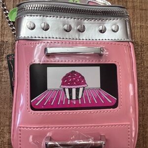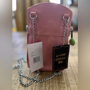 NWT Limited Edition L’oven You Betsey Johnson bag in pink and silver. Features a playful design, with chain purse strap. Has cute coin purse attached.