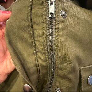 Chic utility jacket with button and zip front. Features multiple pockets for convenience. Cinch at the waist from interior. 98% cotton.