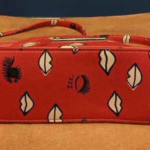 Vibrant red bag with quirky lip and eye design. Adds a playful flair to your style.
