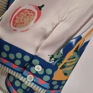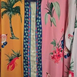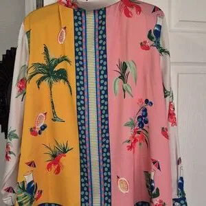 Vibrant blouse/jacket with tropical print. Features palm trees and floral designs
