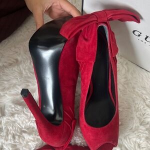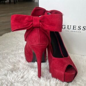 Elevate your look with these vibrant red heels from Guess. Features a chic bow and peep-toe design.